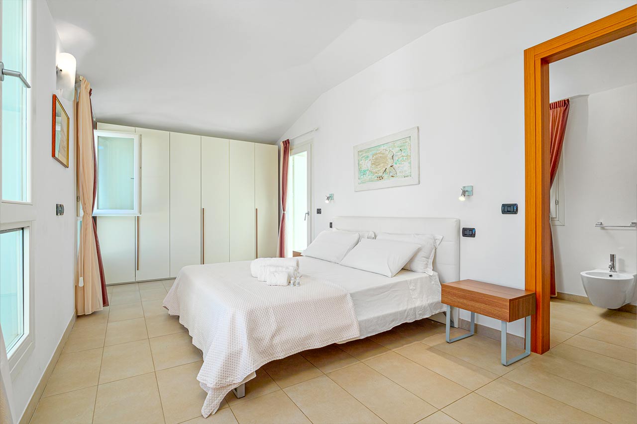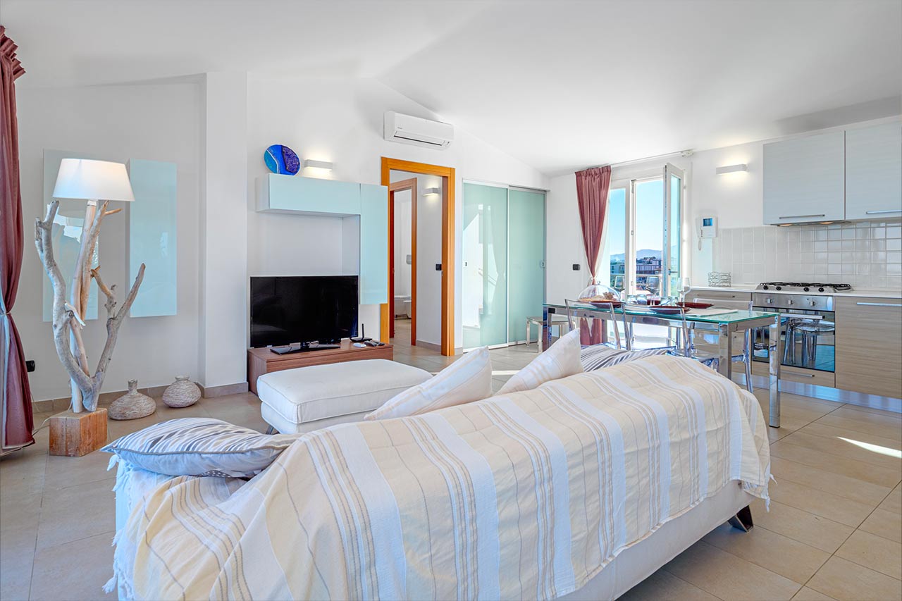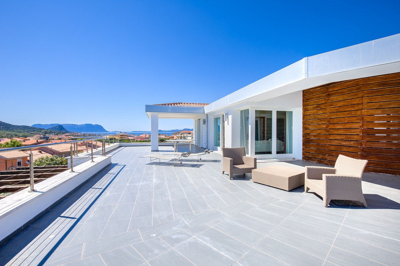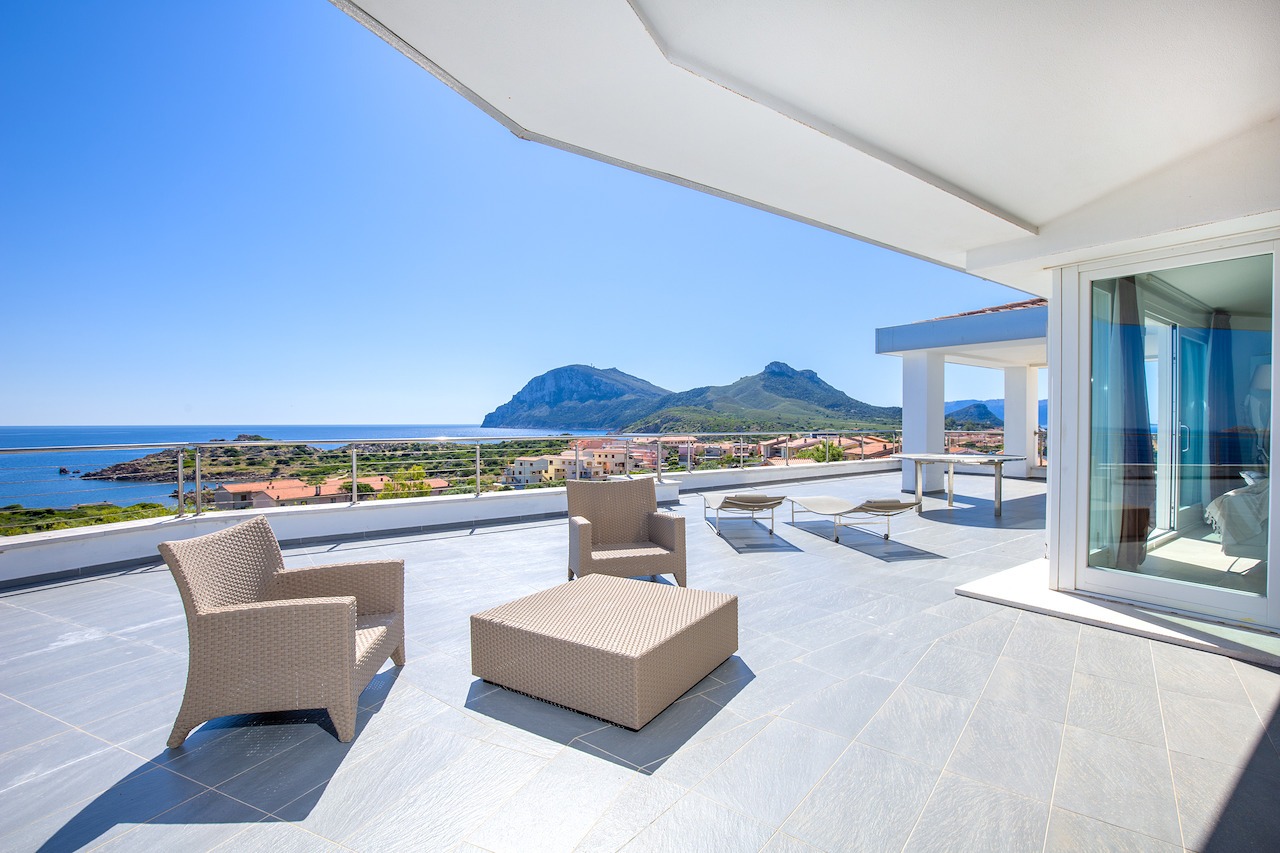 The 100 sqm penthouse apartment has an open living/dining area and a well equipped kitchen with a dishwasher. With 2 bedrooms and 2 bathrooms, it can accommodate up to 4 people. Additional amenities include air conditioning, satellite TV and a washing machine. Furthermore, the child-friendly holiday apartment has a cot, a baby bed and a high chair. The 360°-degree panoramic terrace invites you to sunbathe here during the day. Sun loungers are also available for your use. In the evenings you can enjoy spectacular sunsets here with a cocktail in your hands. In less than 10 minutes walking distance you can reach the centre of Golfo Aranci, where you will find various shopping facilities, restaurants, bars and cafés. The nearest beach is only 500 m away (a 5-minute walk).