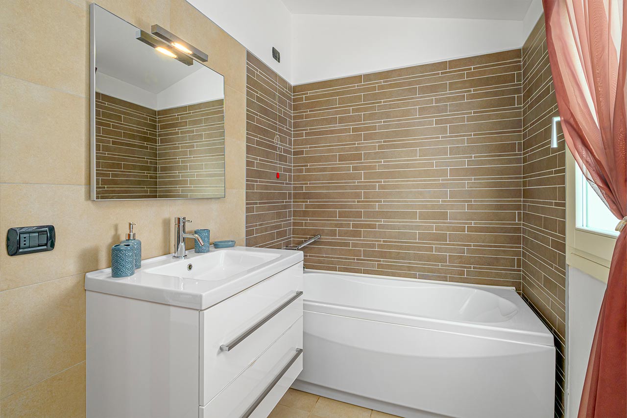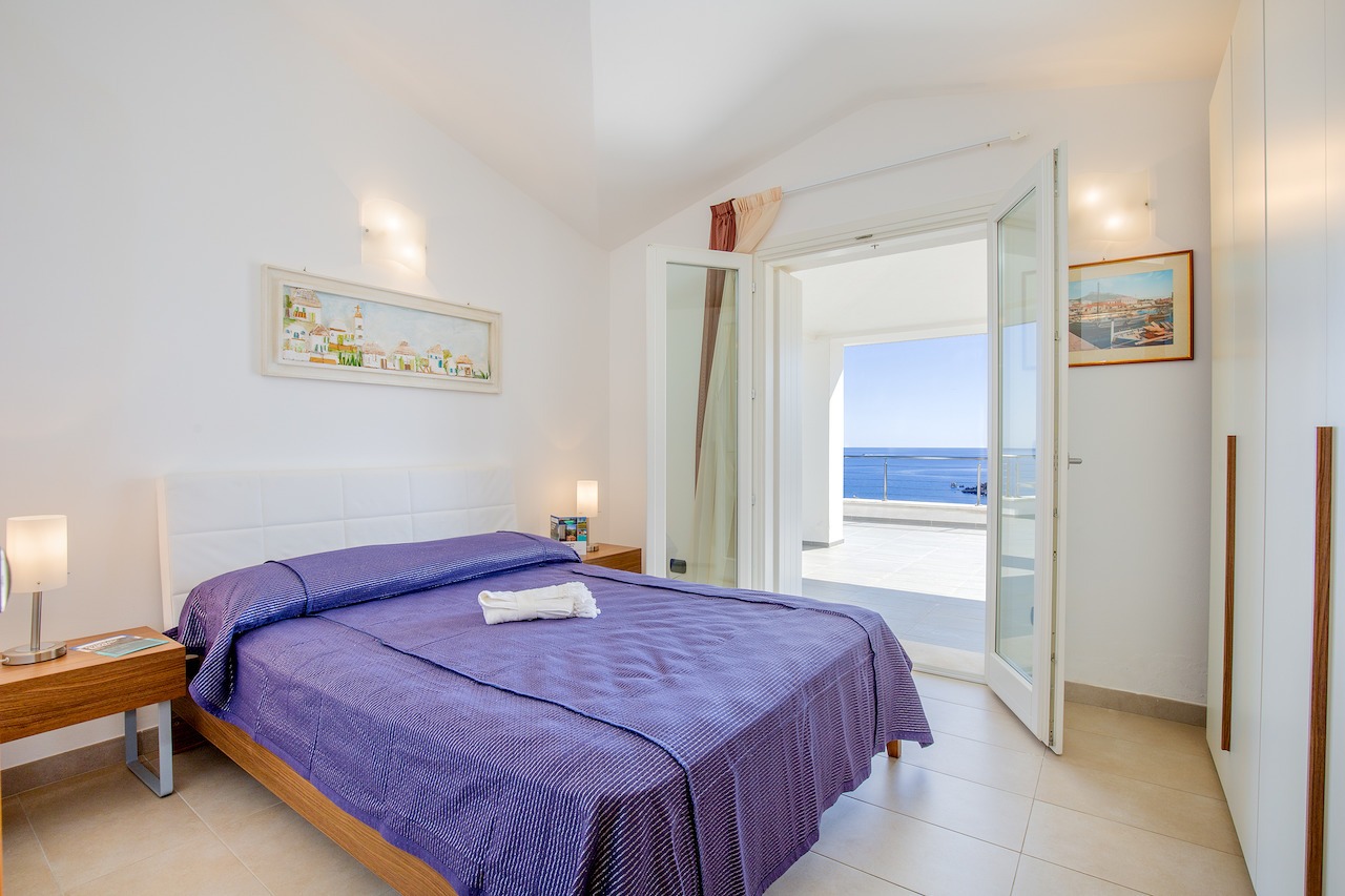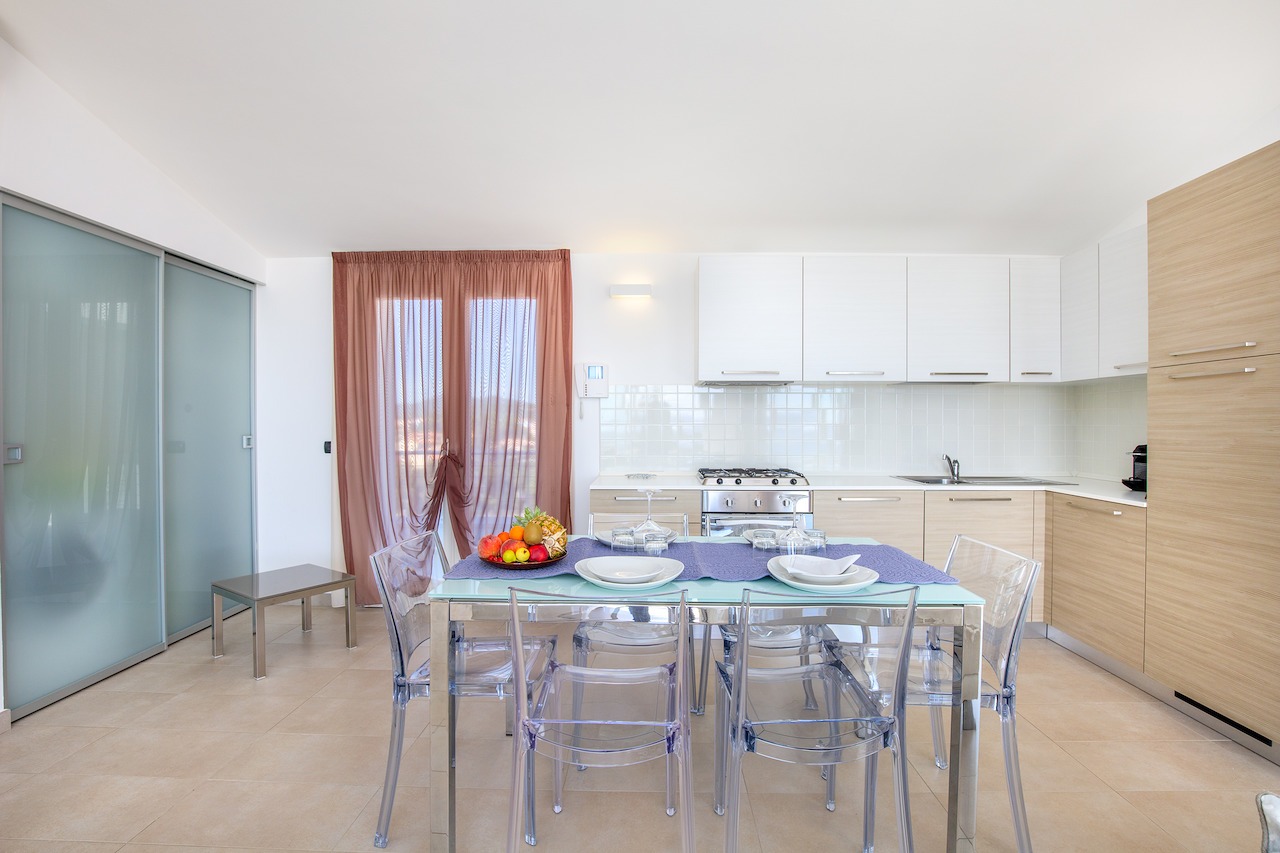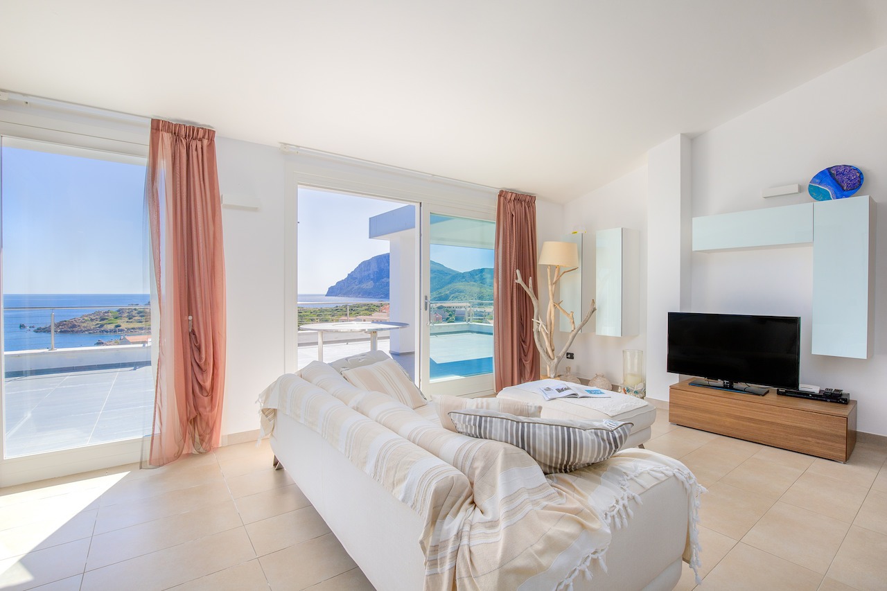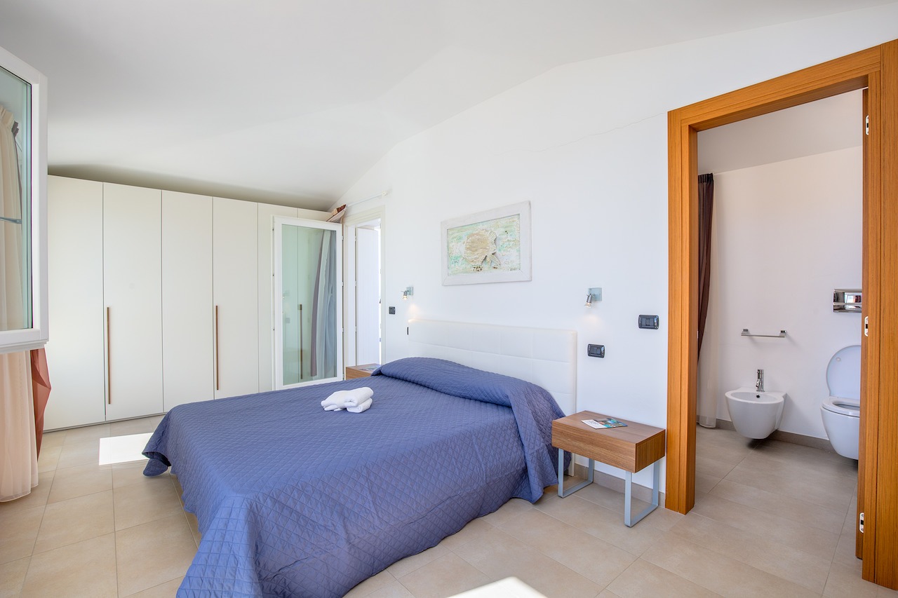 The 100 sqm penthouse apartment has an open living/dining area and a well equipped kitchen with a dishwasher. With 2 bedrooms and 2 bathrooms, it can accommodate up to 4 people. Additional amenities include air conditioning, satellite TV and a washing machine. Furthermore, the child-friendly holiday apartment has a cot, a baby bed and a high chair. The 360°-degree panoramic terrace invites you to sunbathe here during the day. Sun loungers are also available for your use. In the evenings you can enjoy spectacular sunsets here with a cocktail in your hands. In less than 10 minutes walking distance you can reach the centre of Golfo Aranci, where you will find various shopping facilities, restaurants, bars and cafés. The nearest beach is only 500 m away (a 5-minute walk).